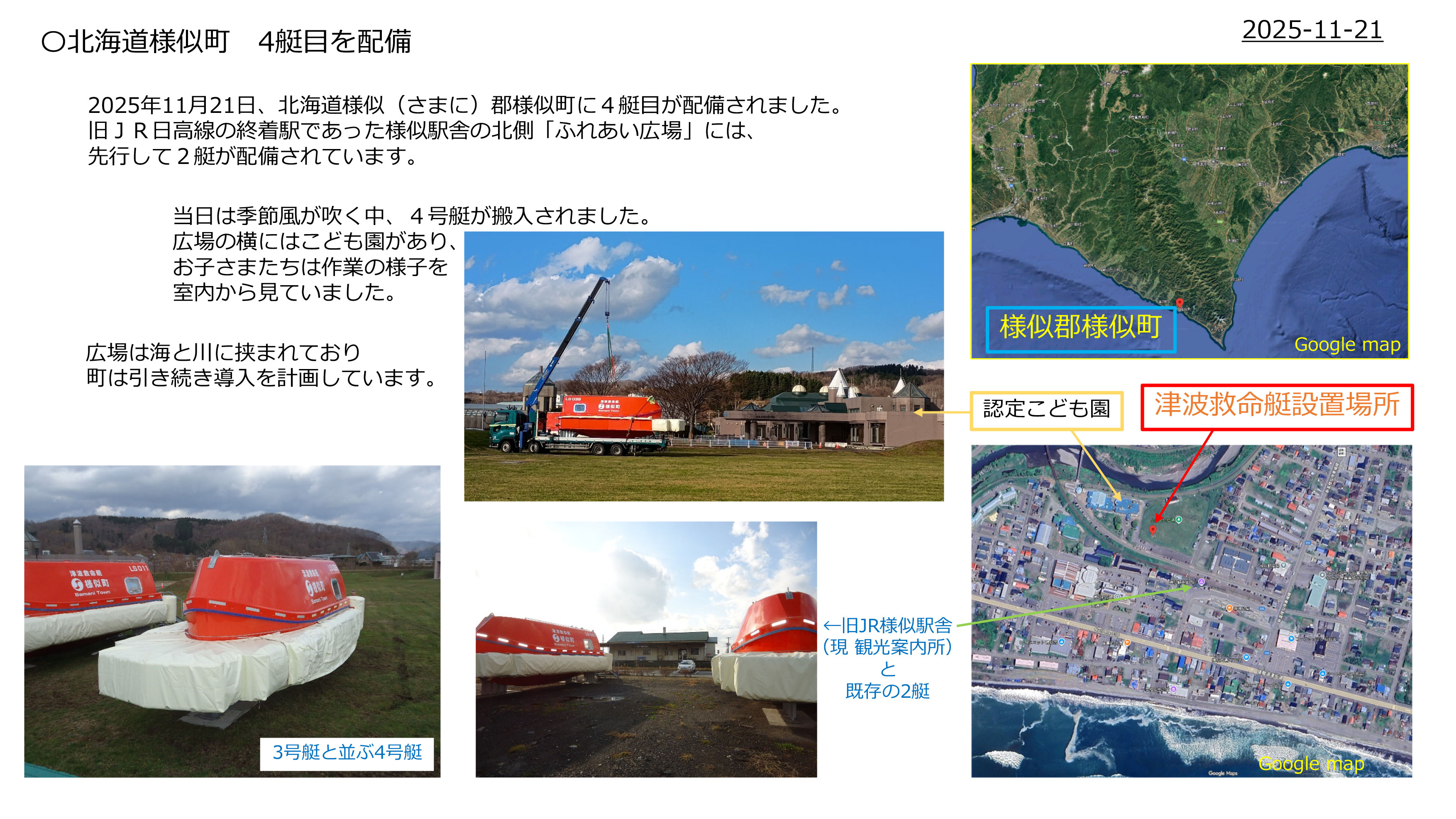 しかしながら、津波救命艇は現在全国に45隻(令和7年4月時点)が設置されている状況にあります。そのため、多くの助けられる命を助けられない状況にあると言わざるを得ず、「津波救命艇ガイドライン」を満足する安全・安心な津波救命艇の普及が急がれています。